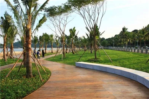 现在走在沙滩上可以看到,木栈道和慢行车道双双相伴,有时互相交错,有时平行前行。木栈道宽3米,蜿蜒的原色木纹与沙滩、椰树形成南方独有的自然景致。